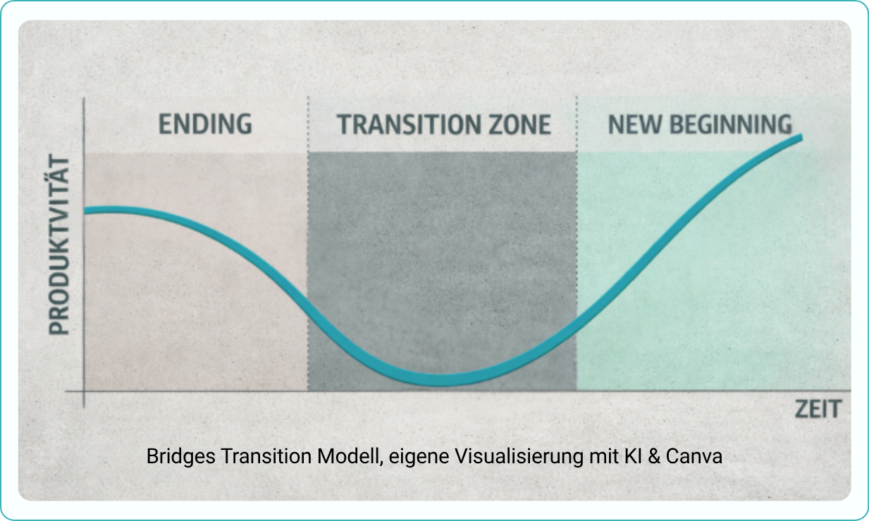 Das Transitionsmodell von William Bridges beschreibt 3 stark vereinfachte Phasen. Zu Beginn endet das Alte. Jahrelang bewährte und etablierte Prozesse, Routinen und Strukturen werden in der Transformation eingerissen oder verändert. Neben emotionalen Reaktionen wie Ablehnung und Unsicherheit sinkt die Produktivität massiv. Das ist der Moment, wenn die etablierten Arbeitsabläufe nicht mehr funktionieren und die neuen noch nicht eingespielt sind und einen enormen Kraftaufwand von allen Beteiligten erfordern. Frustration, Desorientierung und Skepsis dominieren. Neue Routinen müssen etabliert werden, die Organisation beschreitet neue Pfade und muss kreative Lösungen für Hindernisse finden.