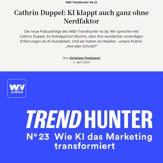 Hier der Link zum W&V Trendhunter Podcast und dazugehörigen Interview, in dem ich meine persönlichen Erfahrungen zu Beginn meiner KI Reise teile: